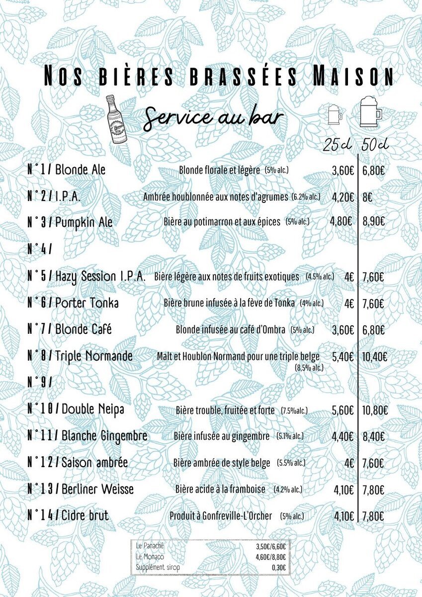 Installé sur le quai de Southampton au Havre, venez découvrir un large choix de bières! Nos bières sont toutes fabriquées au Havre par David et changent toutes les semaines selon les saisons, les matières ou bien tout simplement selon l’envie du brasseur!Pour la nourriture, c’est un peu la même chose, tout est préparé maison par Quentin, notre cuistot, qui a aussi un grand plaisir à nous changer tout le temps la carte! D’ailleurs, nous allons essayer de  modifier notre carte chaque semaine, vous nous excuserez si nous ne l’avions pas fait…